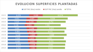 La superficie cultivada de melón y sandía en Castilla La Mancha en el año 2025, según la declaración de ayuda de Pago Único “PU”, se situó en torno a las 10.574 hectáreas, lo que supone un incremento del 17% de superficie de cultivo respecto a la campaña anterior y la mayor superficie cultivada de los últimos 11 años, correspondiendo al melón 6.474 hectáreas y a la sandía 4.100 hectáreas, con un incremento del 15 y 20% respectivamente, respecto a la campaña anterior.